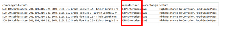 Example of how Manufacturer name will be input in Excel sheet