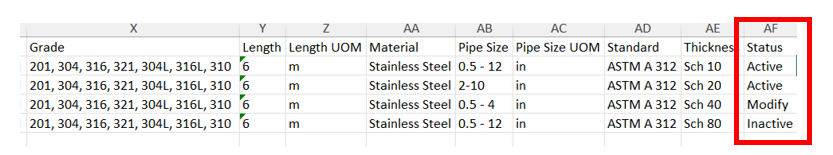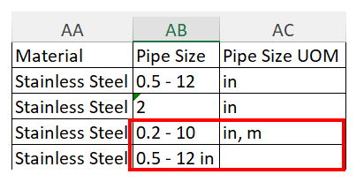 Example in terms of Pipe Size: The value “0.5 – 12” are written under pipe size column and “in” is mentioned in UOM column>/